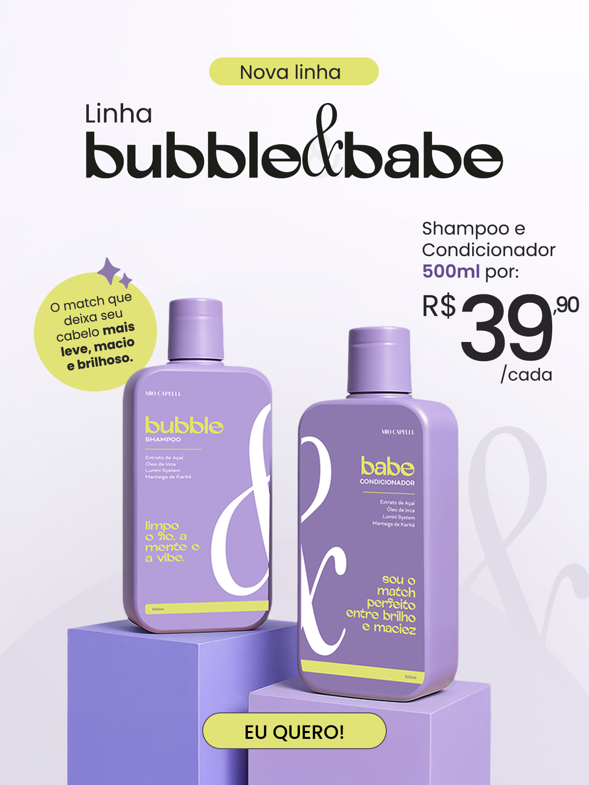 A nova dupla Bubble & Babe Mio Capelli une ativos poderosos para transformar seu cuidado diário. O Bubble limpa profundamente com Açaí, Pantenol e Aminoácidos, tirando a opacidade sem ressecar enquanto o Babe finaliza com Óleo Inca, Karité e Açaí, hidratando de forma leve, desembaraçando e devolvendo a maciez natural dos fios.