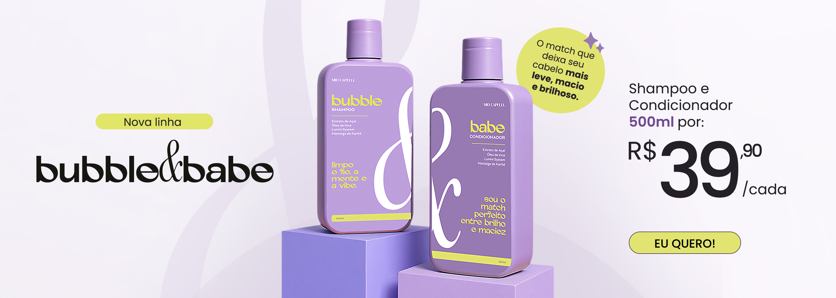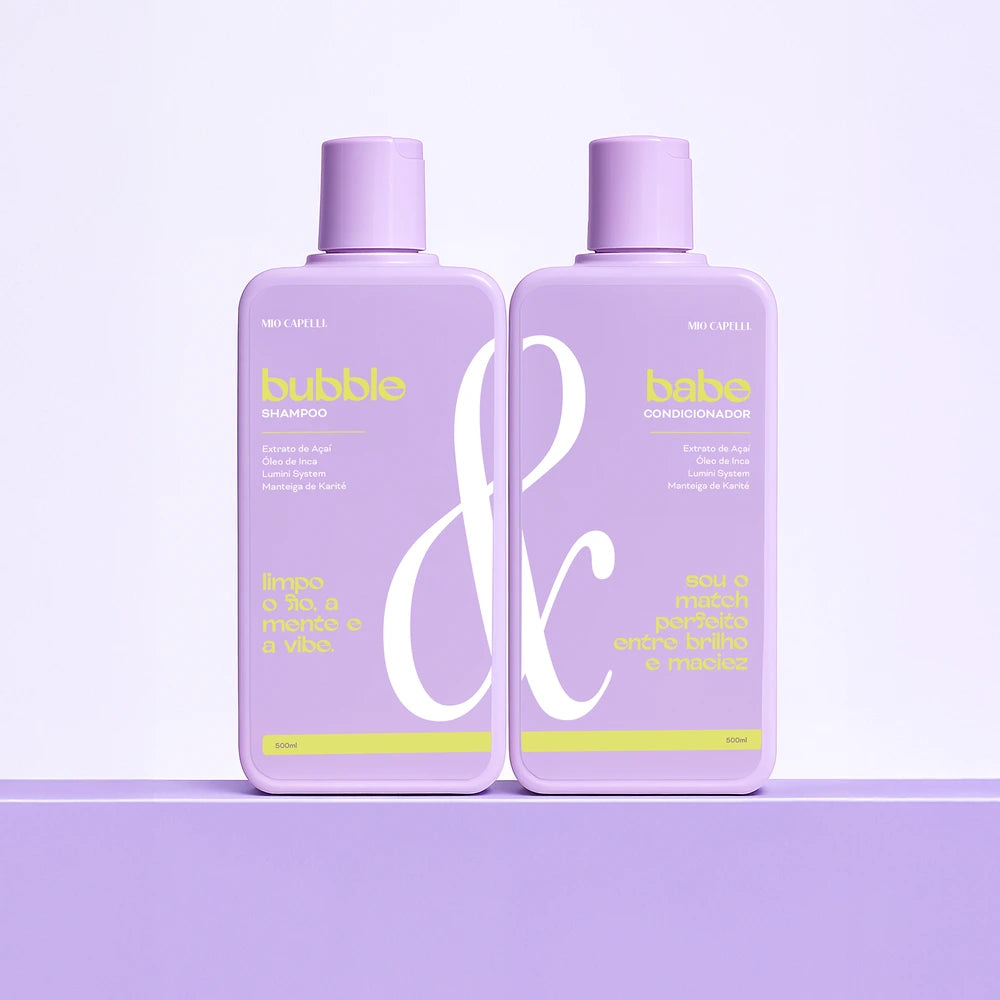 A nova dupla Bubble & Babe Mio Capelli une ativos poderosos para transformar seu cuidado diário. O Bubble limpa profundamente com Açaí, Pantenol e Aminoácidos, tirando a opacidade sem ressecar enquanto o Babe finaliza com Óleo Inca, Karité e Açaí, hidratando de forma leve, desembaraçando e devolvendo a maciez natural dos fios.