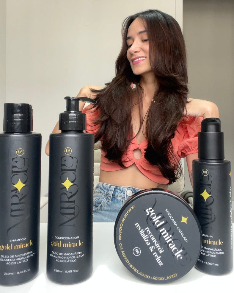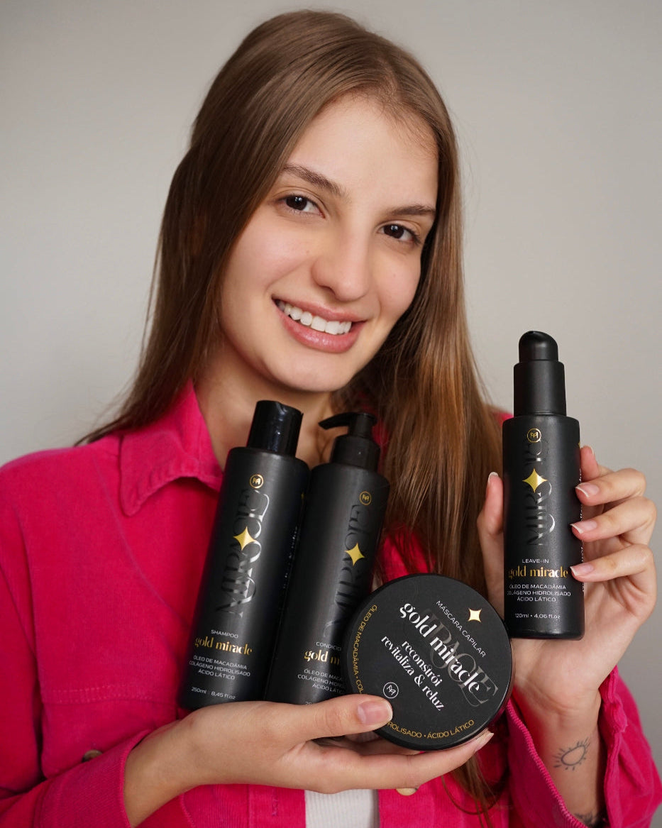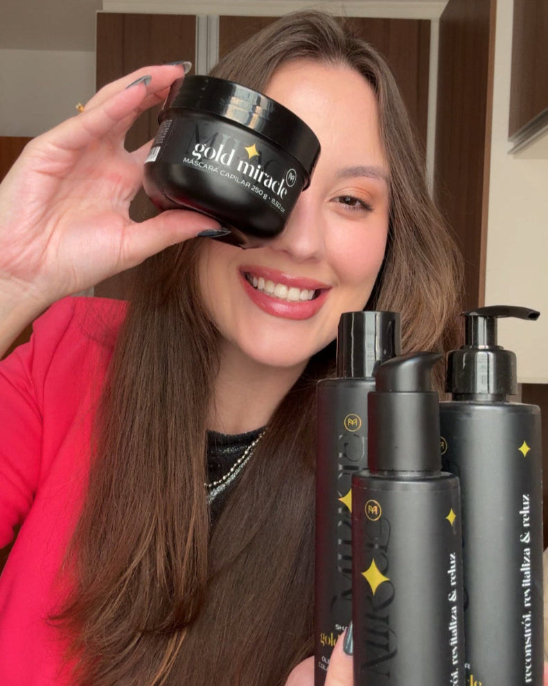 O Kit Gold Miracle é mais do que um tratamento: é um ritual de reconstrução e brilho premium, capaz de transformar cabelos opacos em fios saudáveis e radiantes.