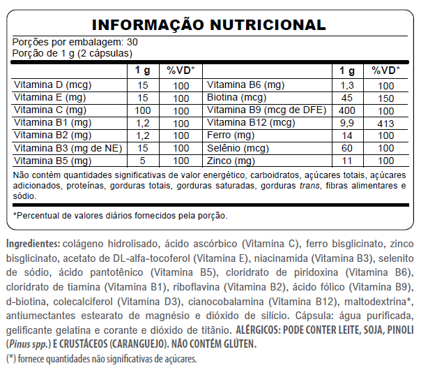 Não contém frutos do mar na fórmula, mas pode haver traços pelo processo produtivo. Em caso de alergia, o consumo não é recomendado.