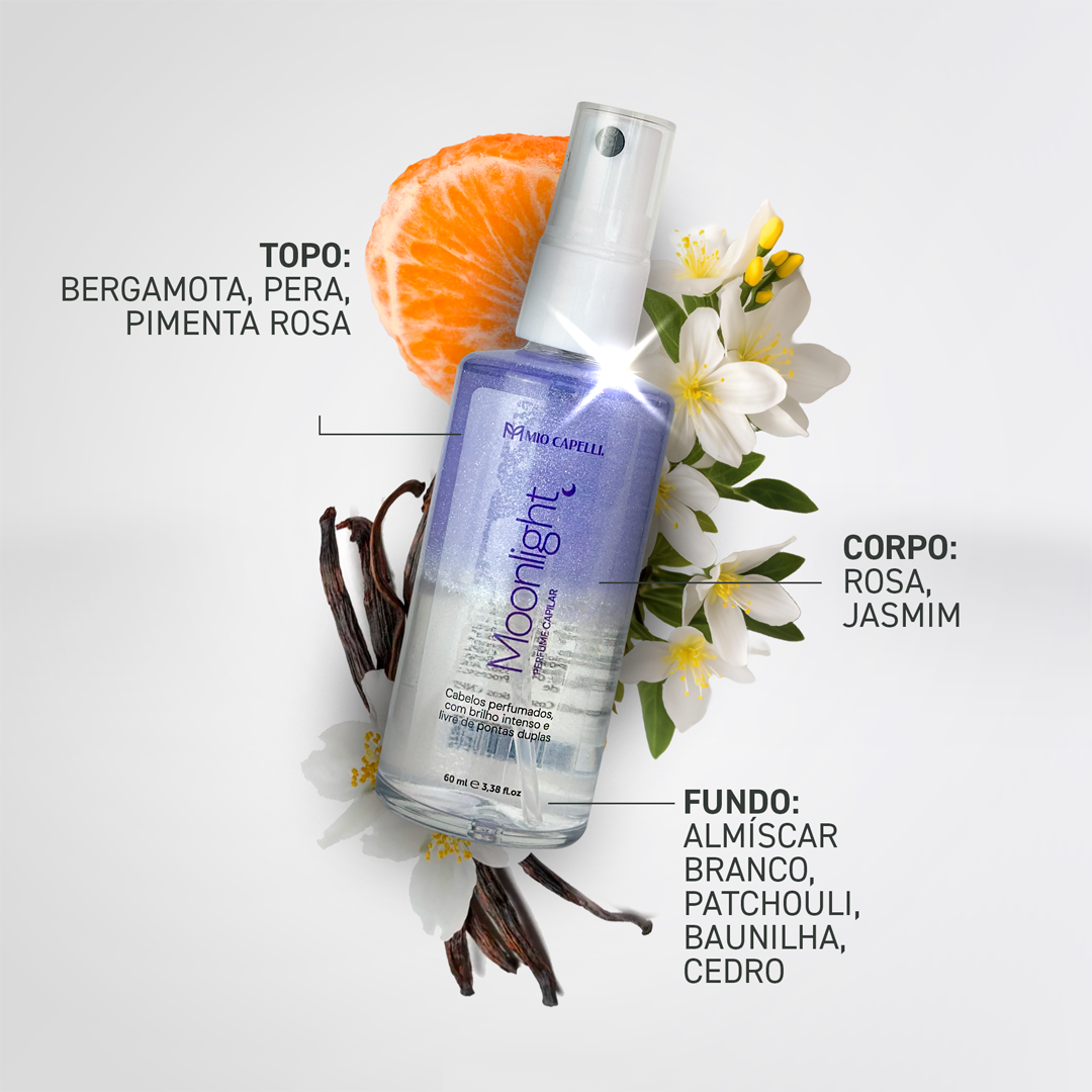 O Perfume Capilar Moonlight Mio Capelli® é um finalizador bifásico (água + óleo) que desembaraça, perfuma e revitaliza os fios, garantindo brilho natural sem pesar. Reduz o frizz, aumenta a maciez e fortalece, com fragrância chipre floral clean de longa duração (inspiração Idôle) e ação desodorante capilar inteligente com propriedades antimicrobianas.