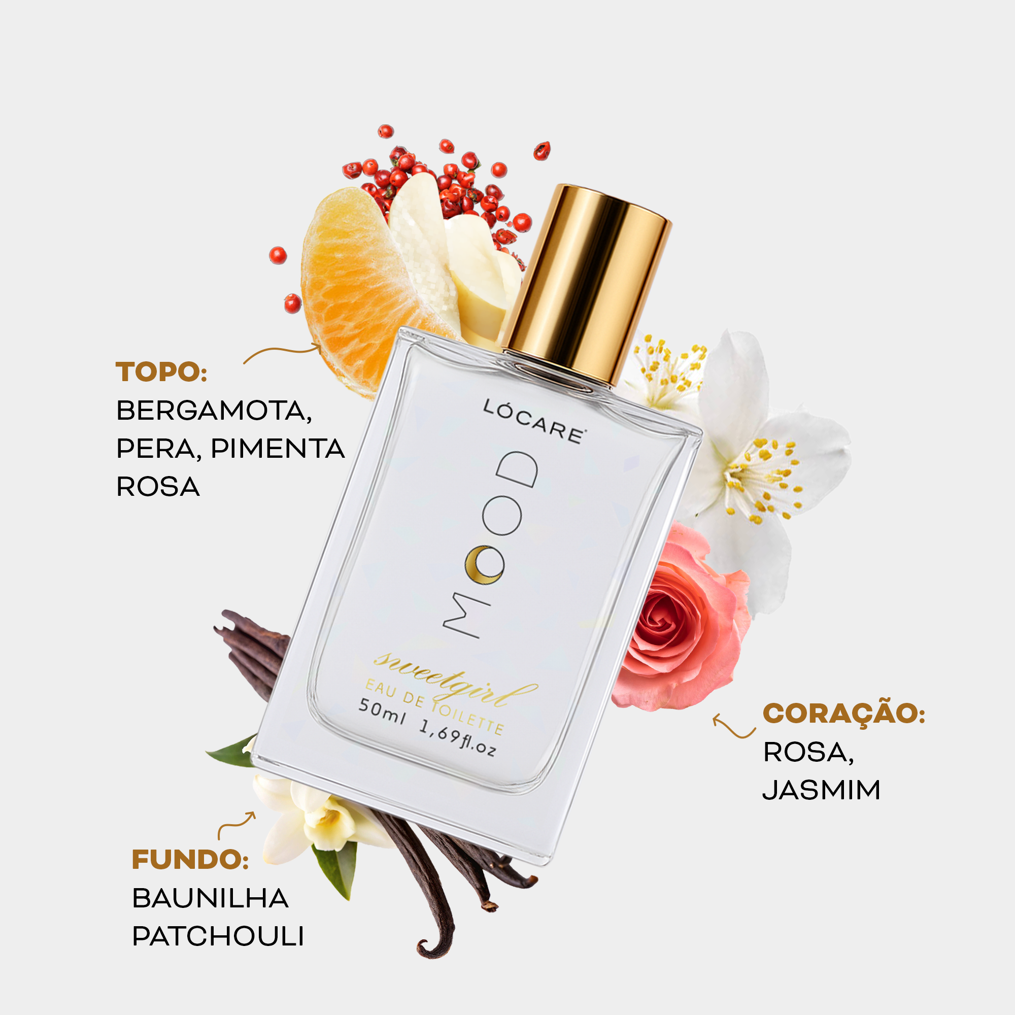 O Sweet Girl abre com notas cítricas e frutadas que despertam frescor, evolui para um coração floral marcante de rosa e jasmim, e finaliza com um fundo cremoso de almíscar branco, baunilha e cedro.