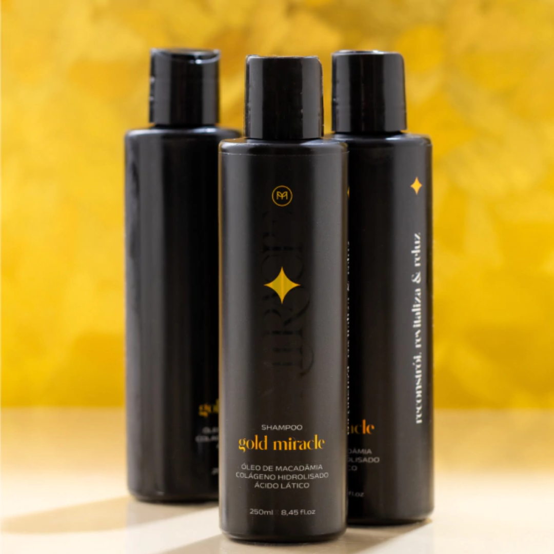 Diferente de shampoos comuns que apenas limpam, o Gold Miracle age durante a lavagem para reparar e nutrir. Com ativos de alta performance, ele reconstrói a fibra capilar enquanto remove resíduos, garantindo que cada fio saia do banho mais forte, saudável e luminoso.