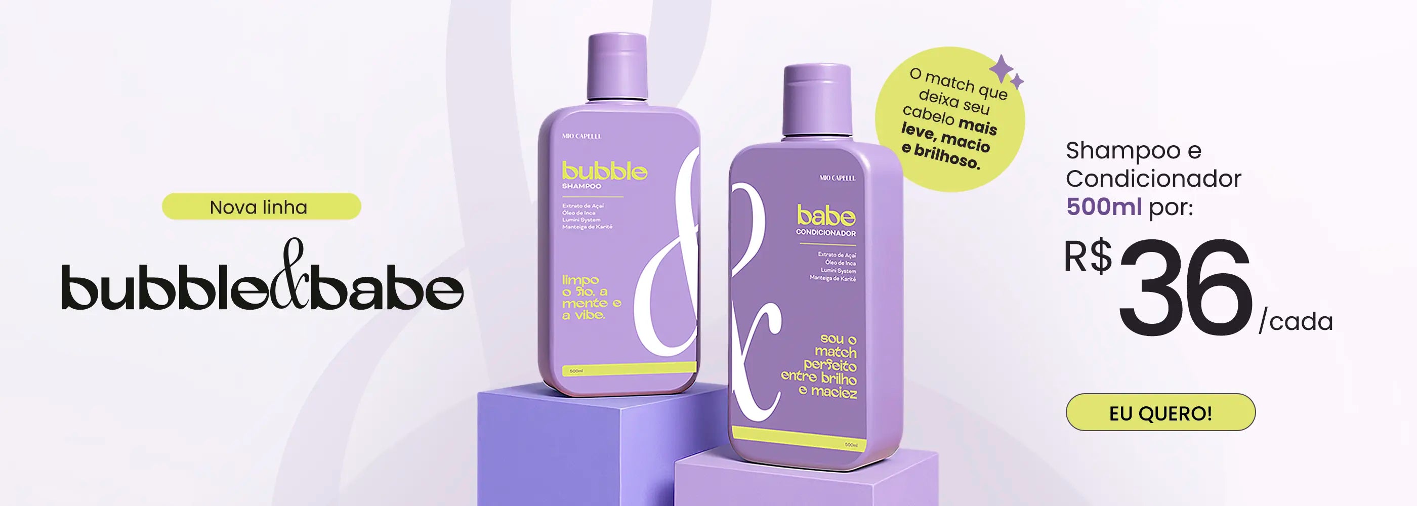 A nova dupla Bubble & Babe Mio Capelli une ativos poderosos para transformar seu cuidado diário. O Bubble limpa profundamente com Açaí, Pantenol e Aminoácidos, tirando a opacidade sem ressecar enquanto o Babe finaliza com Óleo Inca, Karité e Açaí, hidratando de forma leve, desembaraçando e devolvendo a maciez natural dos fios.