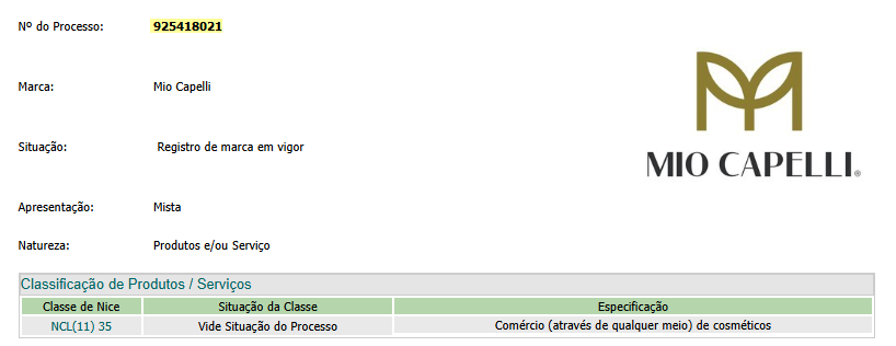 Abaixo, temos o print do registro, que você pode consultar diretamente no site do INPI.