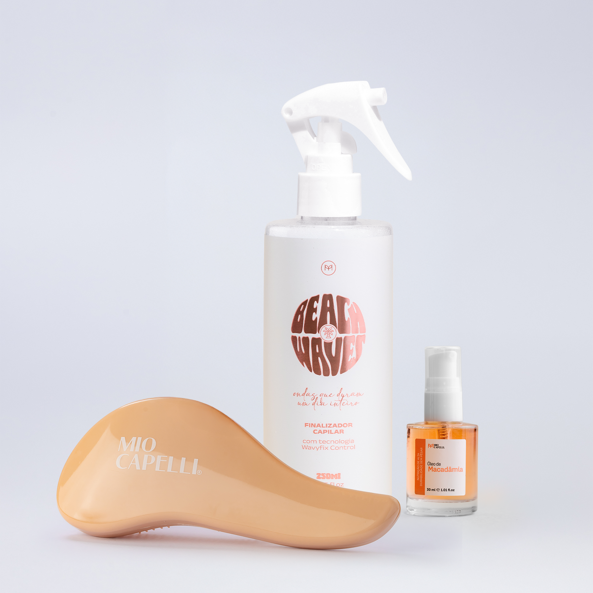 O Kit Verão Mio Capelli combina o poder do Spray Beach Waves, o brilho nutritivo do Óleo de Macadâmia e uma escova mágica exclusiva de brinde, pra te acompanhar em todos os dias quentes.